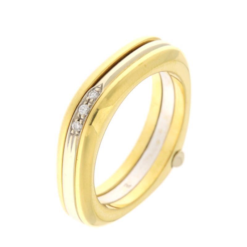 ANELLO IN ORO CON DIAMANTI CT 0.03 Anello in oro giallo e bianco, composto da tre fascette mobili tenute insieme Oro Giallo e Bianco, composto da tre Fedi mobili con gambo piatto e squadrato, la Fede centrale è arricchita da 3 Diamanti taglio Brillante ct 0.03 , colore H, purezza VS,incassatura a griffe e lavorazione lucida.