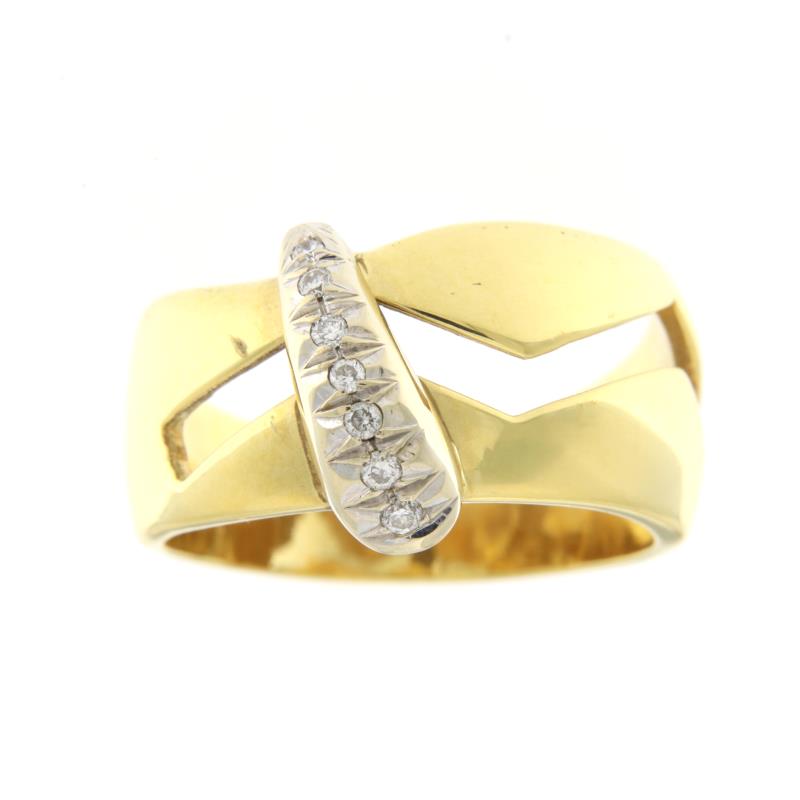 ANELLO IN ORO FASCIONE CON DIAMANTI CT 0.10 Anello in oro giallo e bianco, fascione bombato con traforo centrale a zig-zag, con applicazione a barretta in rilievo e fila di 7 Diamanti taglio Brillante, ct 0.07 tot, Colore H, Purezza VS, incassatura con punte, lavorazione lucida
