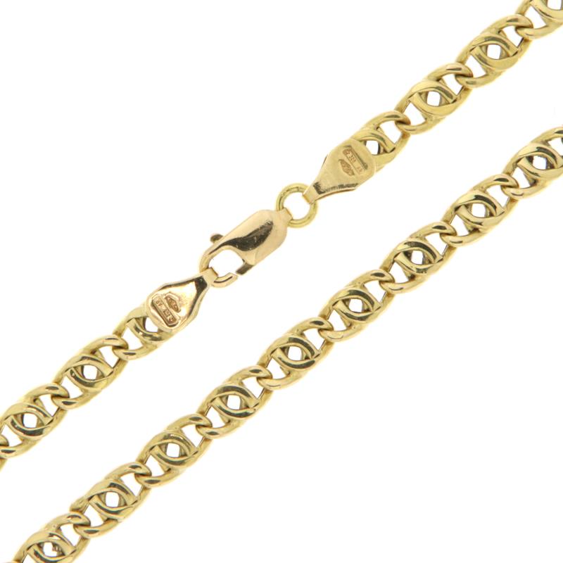 COLLANA IN ORO CON PERLE SINTETICHE Collana in oro giallo a maglia Rolò, con serie di Charms centrali alternati a piastrine a forma di Fiore, diametro 6 mm,a piastrine a forma di Stella, diametro 6 mm e Perle Sintetiche, diametro cm 0.25, lavorazione lucida e chiusura con moschettone