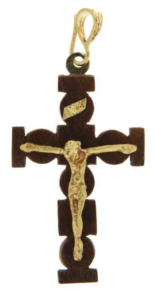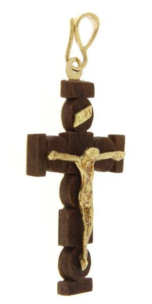CIONDOLO CROCE IN ORO Ciondolo religioso a forma di Croce in legno con parti in oro e sagoma del Cristo in rilievo lavorazione lucida Oro Giallo