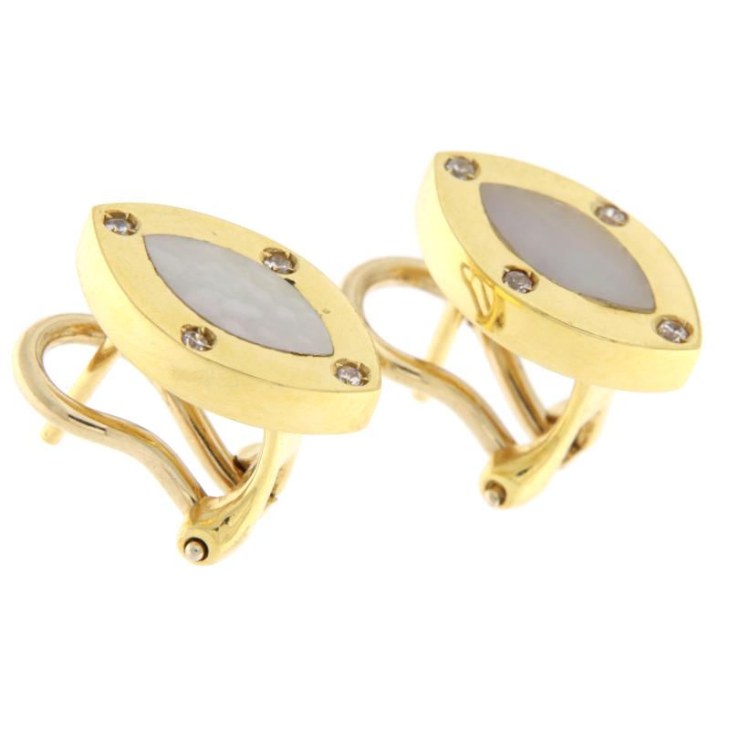 ORECCHINI IN ORO CON MADREPERLA E ZIRCONI Orecchini in oro giallo a lobo a lastra vuota, a forma di Goccia con al centro da una Madreperla taglio a Rombo, la cornice è impreziosita da Zirconi taglio Brillante,incassatura a filo ,con lavorazione luida e chiusra con clips e perno.
